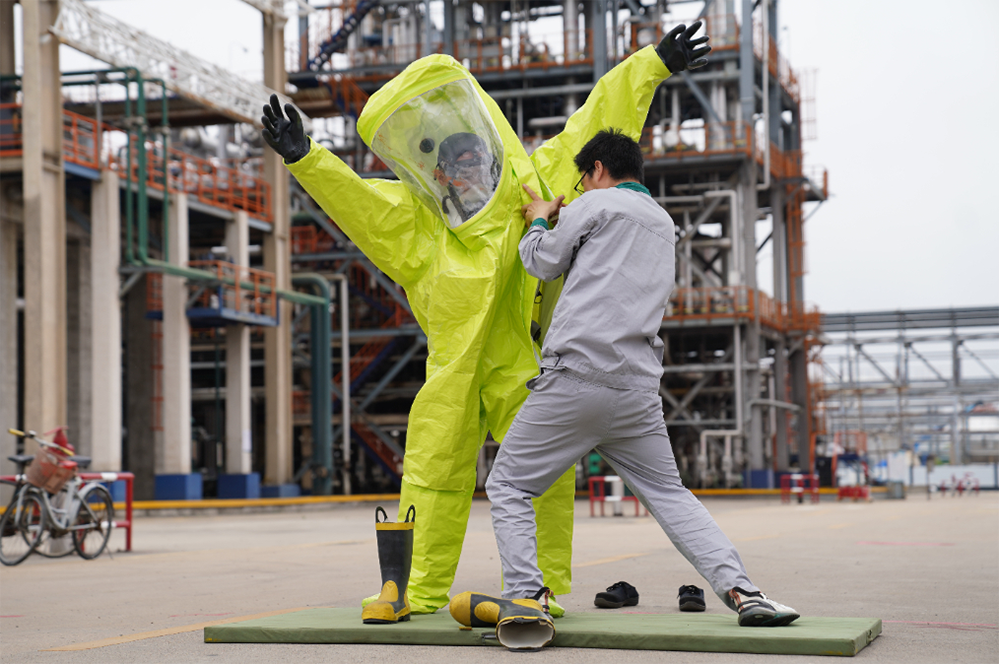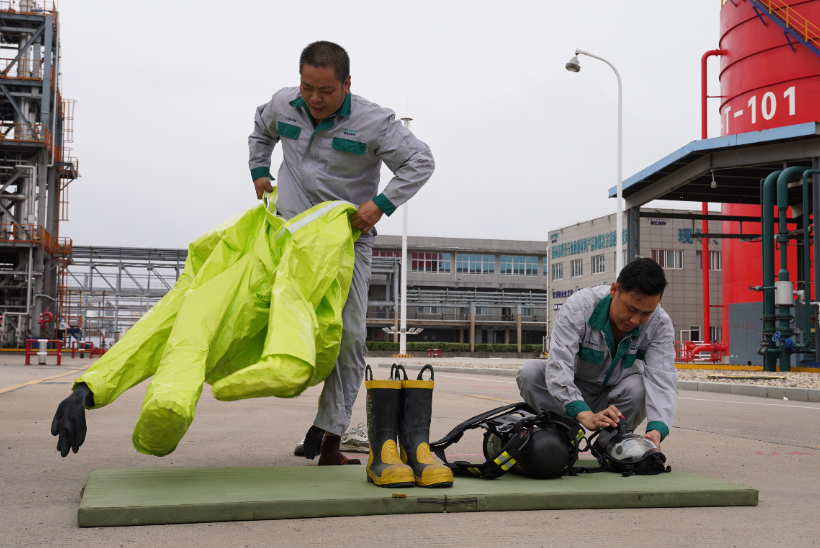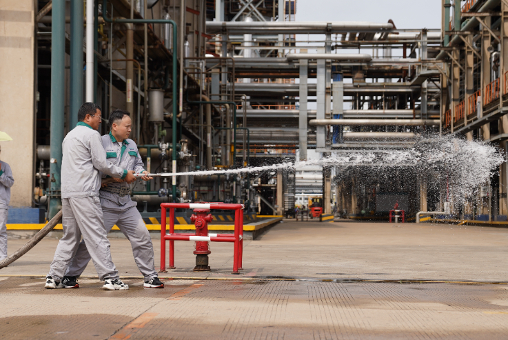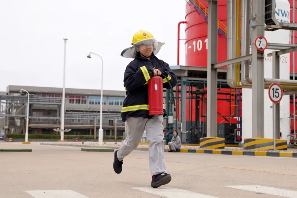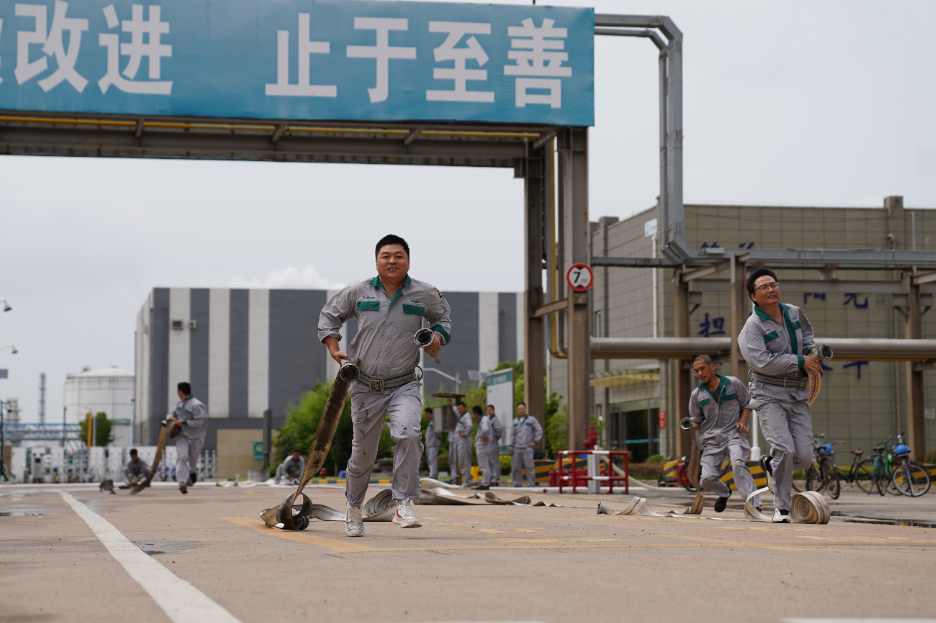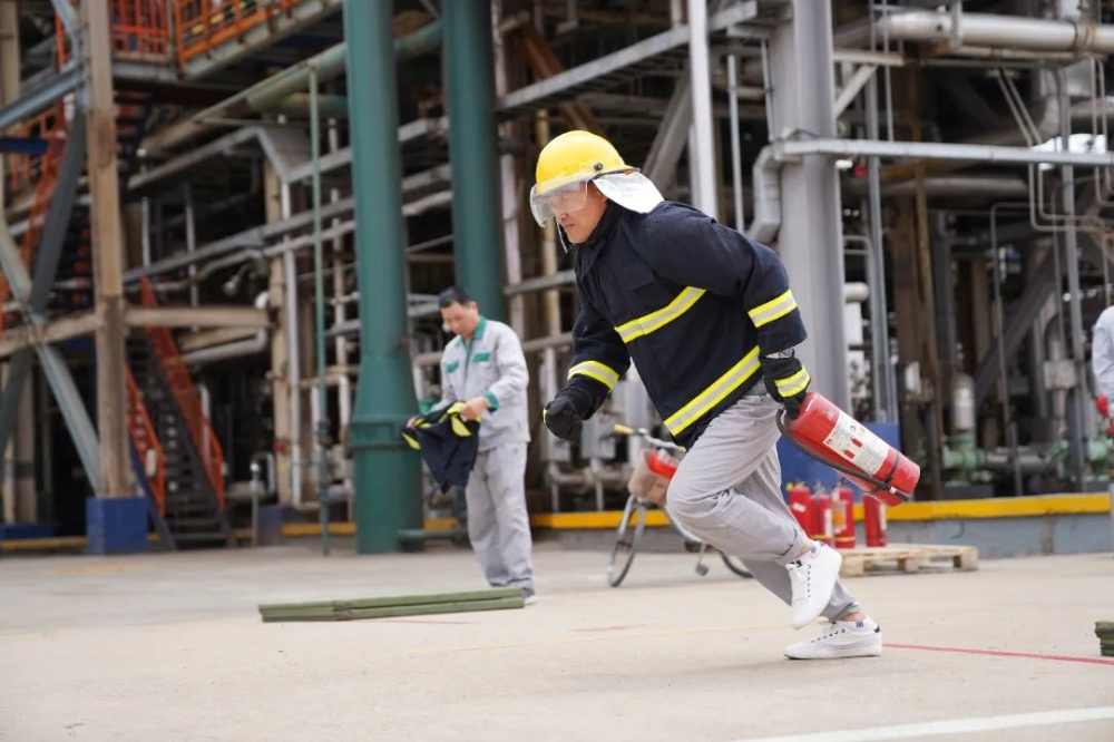 本次比武設(shè)HSE知識(shí)競(jìng)賽、佩戴空呼器著防化服、油桶滅火、三人三帶接力出水擊靶等四個(gè)項(xiàng)目。 盡管盛夏六月驕陽(yáng)似火,但并沒(méi)有阻擋參賽選手們的熱情。在佩戴空呼器著防化服項(xiàng)目中,選手兩兩一組配合默契,從檢查到操作每個(gè)步驟都有條不紊絲毫不差。在三人三帶接力比武現(xiàn)場(chǎng),參賽選手們斗志昂揚(yáng)、奮勇拼搏,快速完成了分水器連接、水帶展開(kāi)、加壓和擊靶等動(dòng)作。