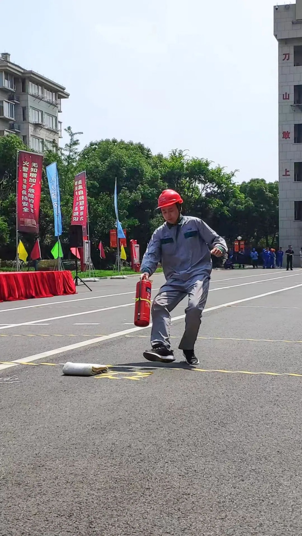 比賽開始,參賽隊員全身心投入,沉著冷靜、配合默契,展示了有效、規(guī)范、安全的應(yīng)急處置和救援能力。選手現(xiàn)場發(fā)揮穩(wěn)定,靈活應(yīng)變,最終女子油桶滅火獲得冠軍,穿戴空呼/防化服獲得亞軍,三人三帶出水擊靶獲得第四名。
